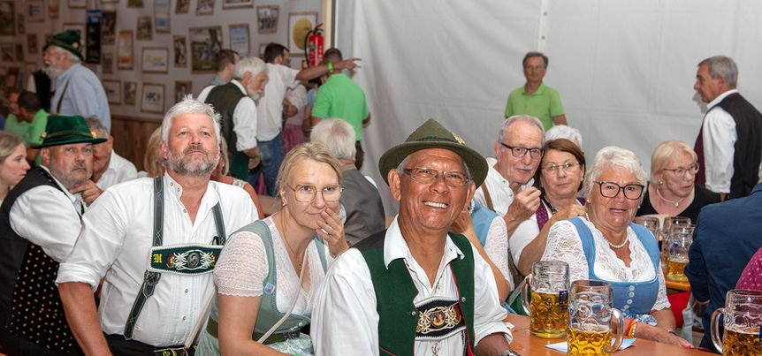 dem Festzug zum Zelt zurück folgte ein plötzlicher Hagelschauer, der Gäste und Musikanten eilig ins Trockene trieb. Unterstützt wurde die Blaskapelle an diesem Tag von den Marketenderinnen Martina Schmid (geb. Maier), Ines Strauch, Maria Gasser (geb. Scheck) und Anita Falkinger sowie Taferlbua Florian Strohmayer. Auch die legendären Barabende im Festzelt trugen ihren Teil zur Festatmosphäre bei. Besonders die spontanen Einlagen mit alten Instrumenten, die eigentlich als Dekoration an der Decke hingen, sorgten für viele herzhafte Lacher und echte musikalische Schmankerl. Wenig Schlaf, viel